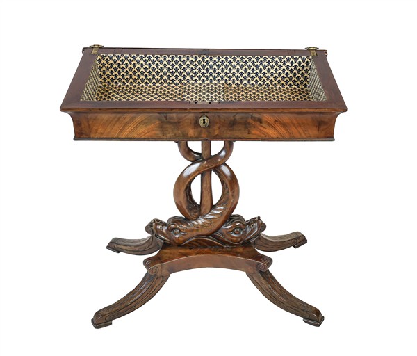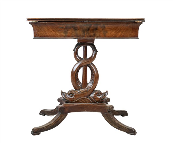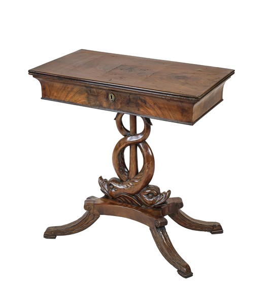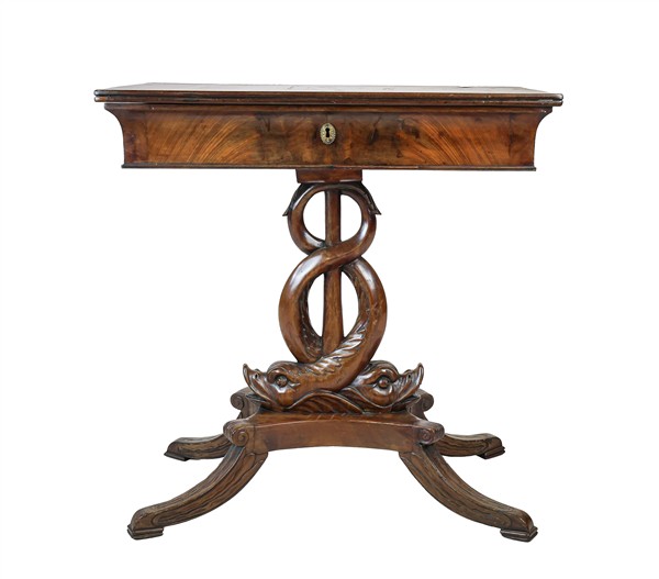 Tavolino da lavoro impiallacciato in mogano con sostegno a doppio delfino intrecciato su base a quattro gambe, piano ribaltabile. Secolo XIX (cm 67x68x37) (difetti)