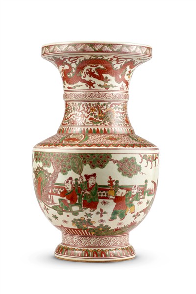 Vaso in porcellana policroma con smalti rossi, verdi e gialli. Il corpo decorato con bambini in un giardino ed il collo con draghi e volatili.