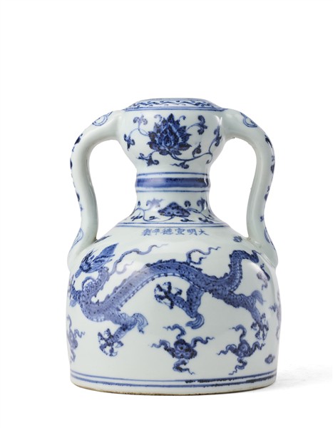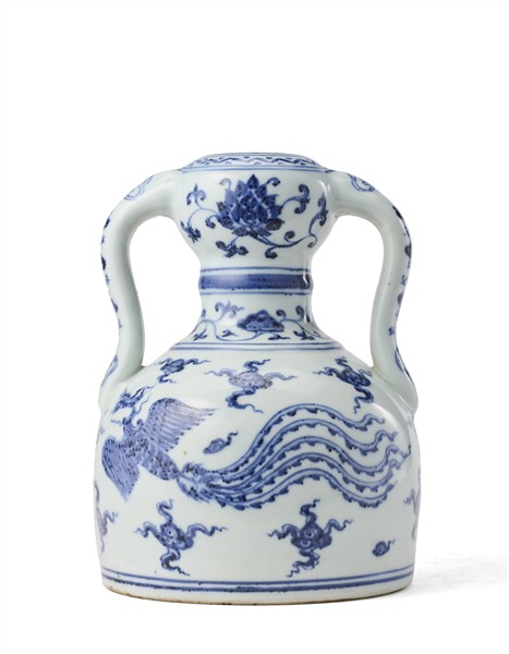 Vaso a doppia zucca, la parte superiore globulare, collo avvitato circondato da una costola rialzata, sopra un bulbo inferiore troncato, e una coppia di anse a forma di S, il vaso in porcellana bianca e blu decorato con drago e fenice e fiori di loto, recante marchio apocrifo