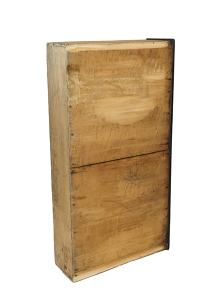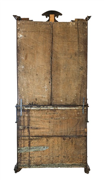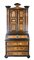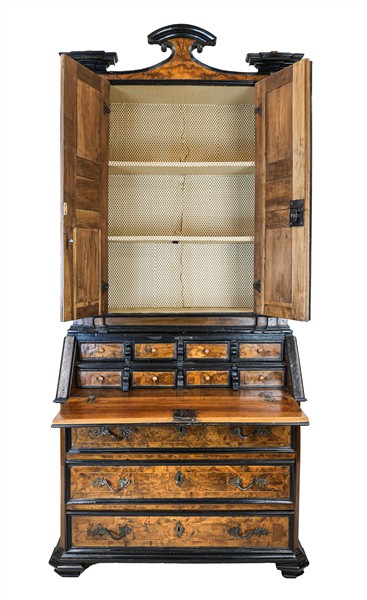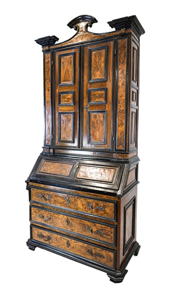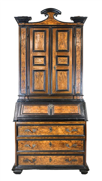 Trumeau in noce con specchiature in radica e bordure ebanizzate, parte inferiore a tre cassetti e calatoia celante otto tiretti e segreti. Secolo XVIII. Parte superiore d'epoca successiva a due sportelli e cimasa mistilinea. (cm 117x255x58) (difetti e restauri)