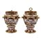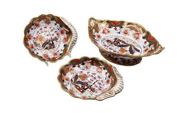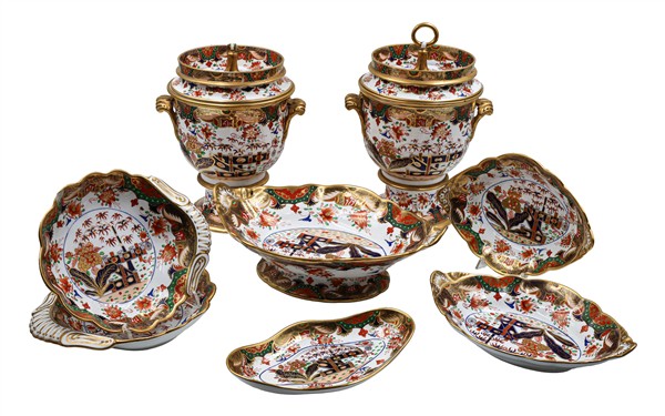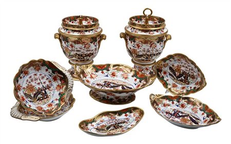 Manifattura di Spode, inizio secolo XIX. Lotto composto da coppia di geliere biansate con vaschetta e coperchio, coppia di ciotole a valva di conchiglia, un'alzata e tre diverse ciotole in porcellana con decoro policromo Imari e profili in oro, marca in rosso "Spode" e numerali "967". (h max cm 34) (difetti e rottura ad una presa ad anello)