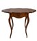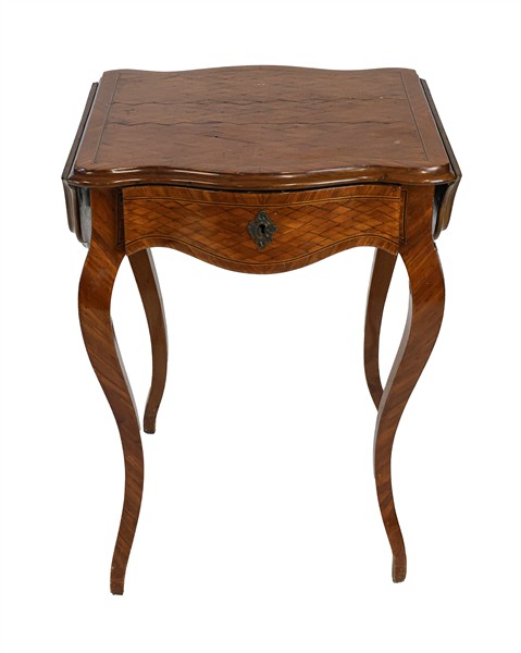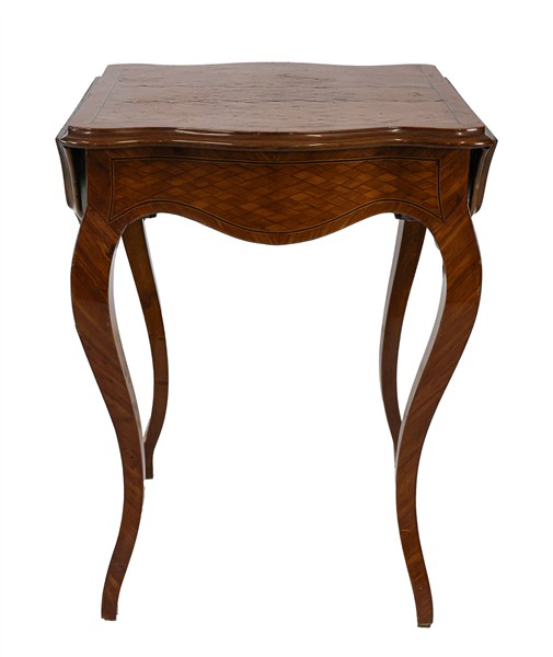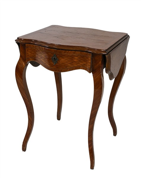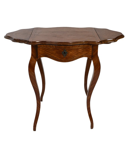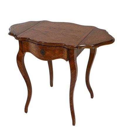 Tavolino ad alette di forma sagomata, lastronato in legni vari e decorato a marqueterie con un cassetto nella fascia. Secolo XIX (chiuso cm 53x70x45) (difetti e piccole mancanze)