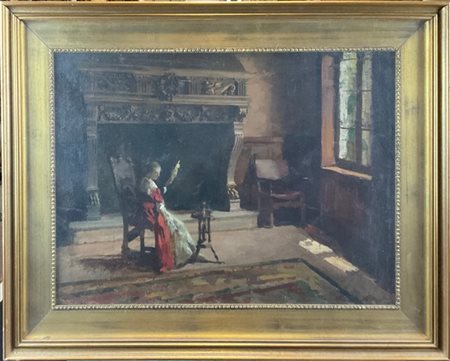 Enrico Ravetta "Studio di interno con donna all'arcolaio" olio su tela (cm 45x6