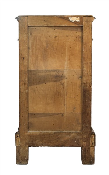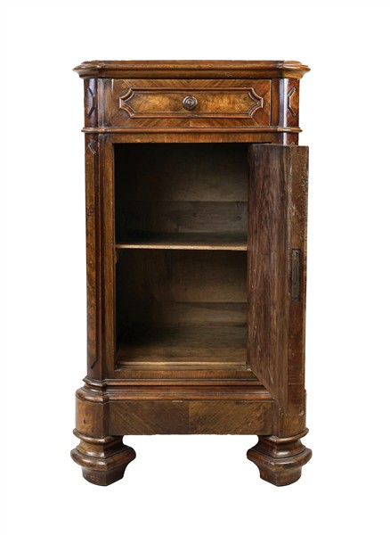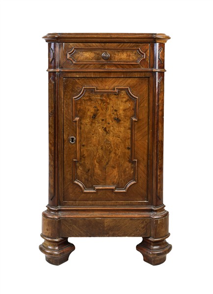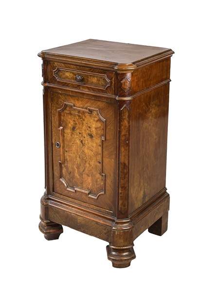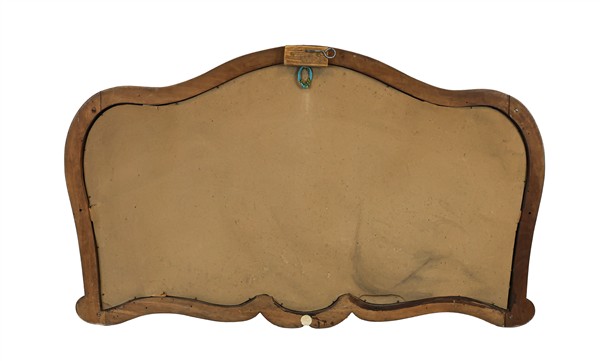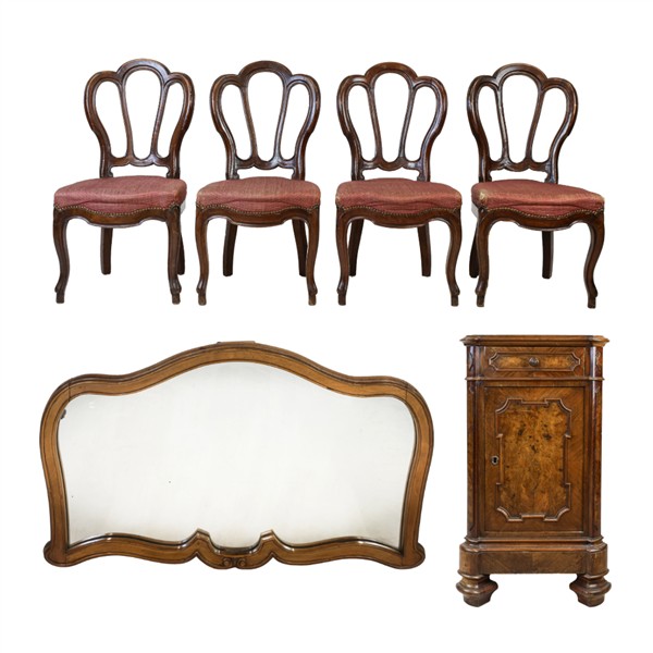 Lotto composto da un gruppo di quattro sedie Luigi Filippo di forma mossa in legno con schienale a giorno, un comodino di fine secolo XIX (cm 46x83x37), ed una specchiera con cornice sagomata in legno (cm 92x56) (difetti e mancanze)