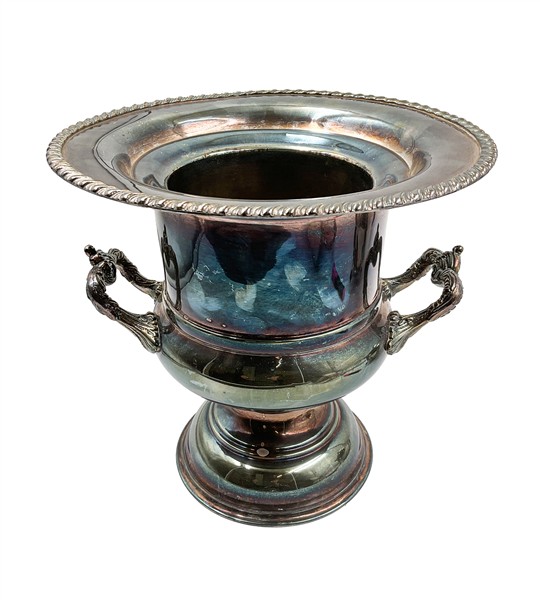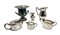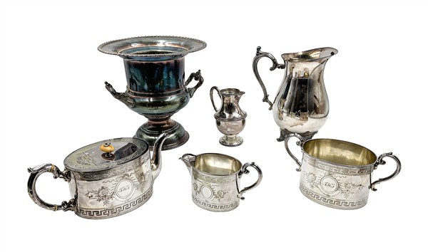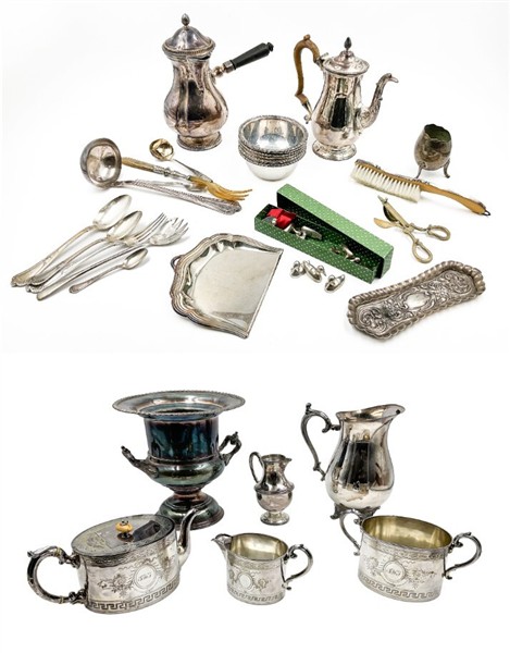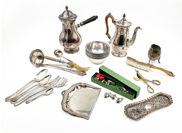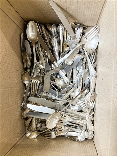 Due cartoni contenenti numerosi oggetti in metallo argentato di forme, usi e decori diversi (difetti)