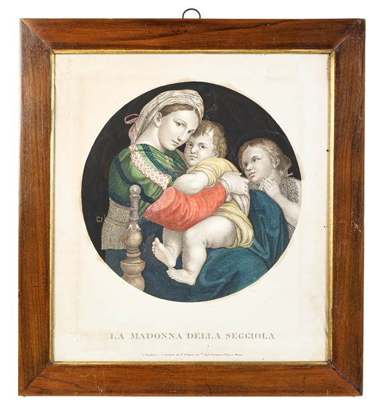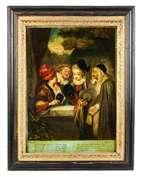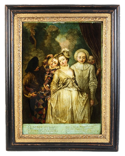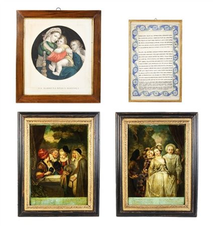 Lotto composto da due incisioni su carta da invenzioni di Watteau fissate su vetro e retro dipinte (cm 36x26), un'incisione su carta raffigurante "La Madonna della Seggiola" da Raffaello (cm 43x39) e una pergamena mediorientale dipinta con iscrizioni (cm 34x21,5). Secolo XIX. In cornici (difetti)