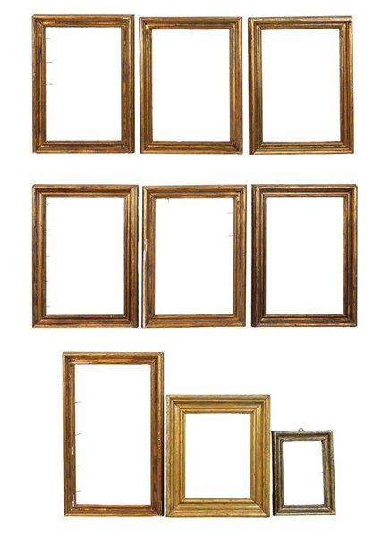 Cartone contente nove diverse cornici in legno dorato di epoche e misure diverse (difetti)