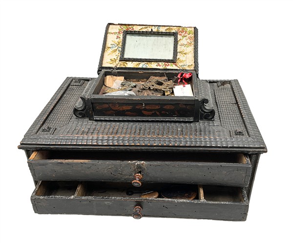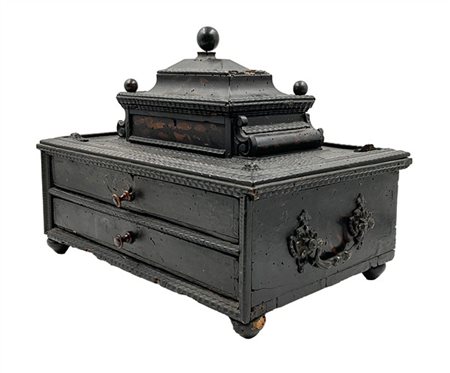 Antica scatola portagioie a due cassetti in legno ebanizzato e parzialmente dip