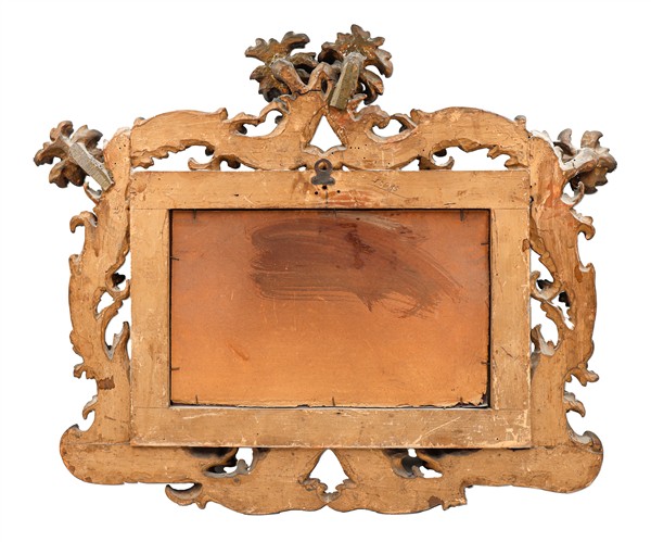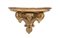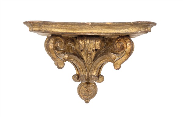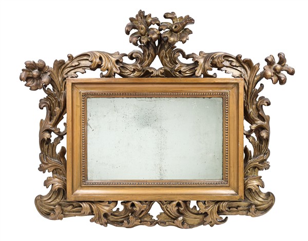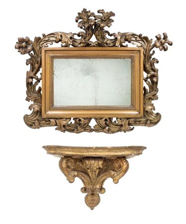 Lotto composto da una specchiera con cornice rettangolare e applicazioni in legno intagliato con decoro a volute fogliacee (cm 78x64) e da una mensola in legno intagliato e dorato a volute (cm 33x22x18) (difetti e mancanze)
