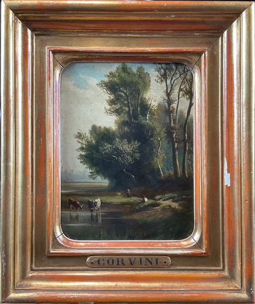 Giovanni Corvini (Attribuito) "Mucche che si abbeverano" olio su carta applica
