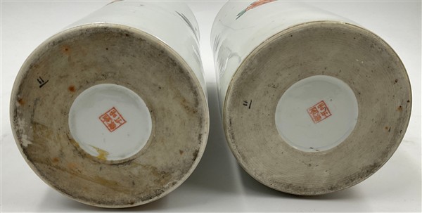 Coppia di porta pennelli in porcellana Famiglia Rosa decorati con volatili e mo