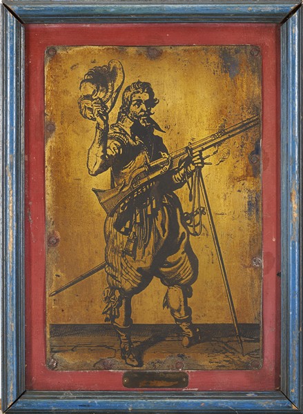 Tre antiche lastre in rame inciso e dorato raffiguranti un soldato con fucile e