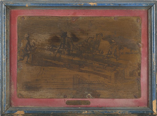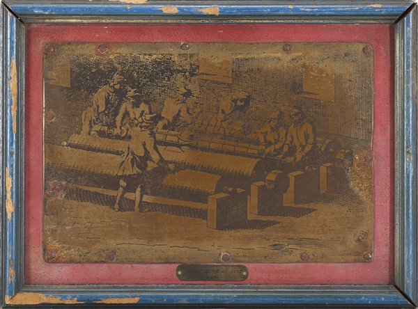 Tre antiche lastre in rame inciso e dorato raffiguranti un soldato con fucile e fabbriche di cannoni con figure. (cm 30x20 e 20x30) In cornici (difetti)