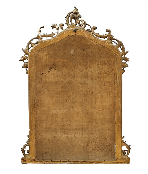 Caminiera in legno e stucco dorato di forma sagomata con cimasa e fregi laterali a volute fiorite. Inizio secolo XX (cm 115,5x110) (difetti, restauri e mancanze)