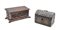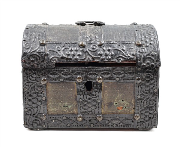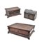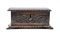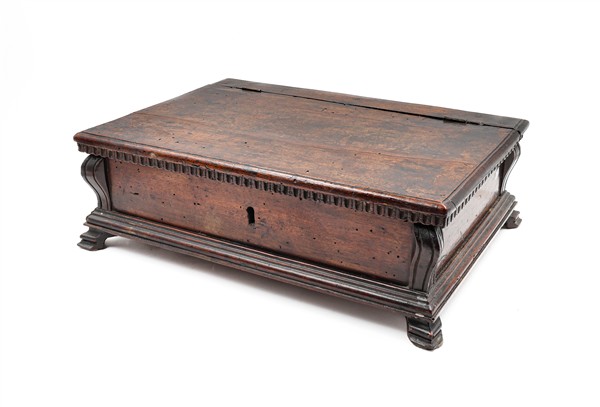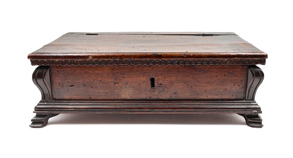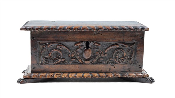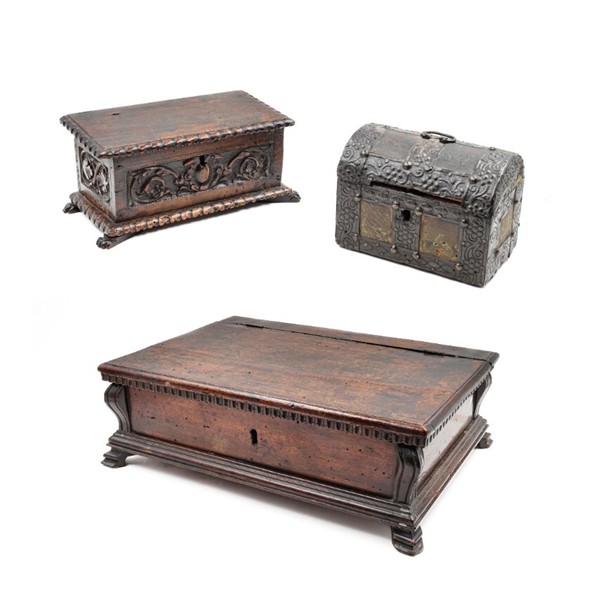 Lotto composto da una scatola porta documenti in legno intagliato (cm 45x14x31), un modellino di cassapanca in legno intagliato con zampe ferine (cm 27x11x13), ed un bauletto in legno, ferro inciso e tessuto (cm 18x13x11). Secolo XVIII-XIX (difetti e mancanze)