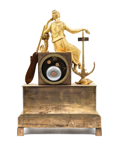 Pendola da appoggio a soggetto allegorico in bronzo dorato. Quadrante in smalto bianco a numeri romani. Movimento a due treni con suoneria delle ore e mezza su campanello. Francia, secondo quarto del secolo XIX (h. cm 42,5) (difetti e piccole sostituzioni)