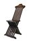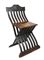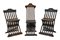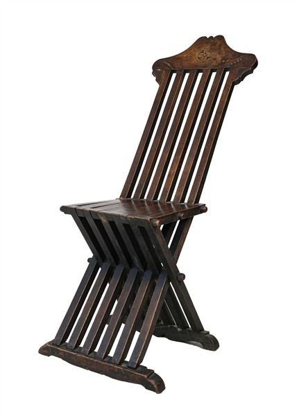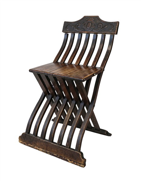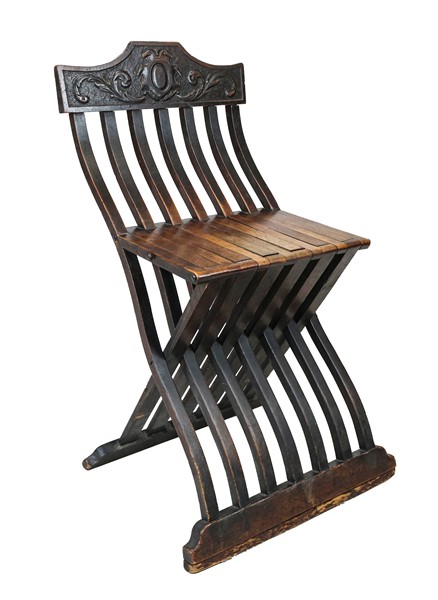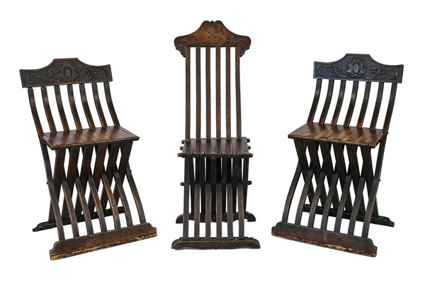 Lotto di tre sedie pieghevoli a listelli in stile neorinascimentale con cimase intagliate (difetti)