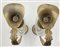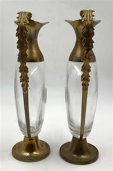Coppia di caraffe con corpo in vetro decorato da profilo femminile entro riserva ovale, presa, collo, base e tappo in metallo dorato (h cm 32) (difetti)