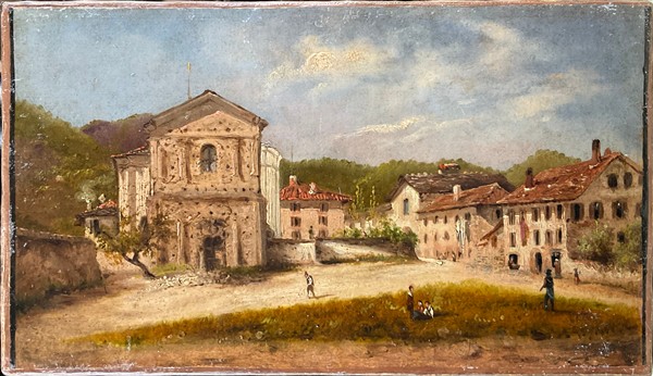 Lotto 1456 | Scuola lombarda del secolo XIX "Scorcio di paese" olio su carta applicata a t