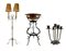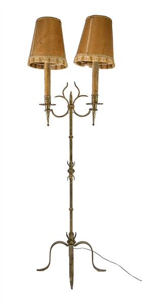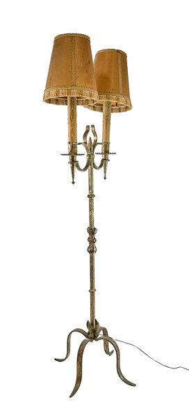 Lotto composto da una lampada a due luci in ferro battuto, un trespolo portafio