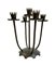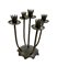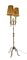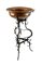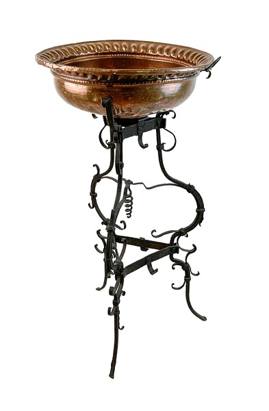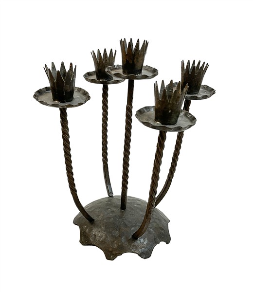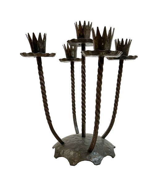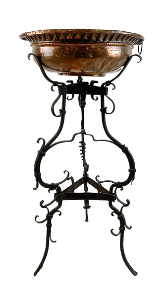 Lotto composto da una lampada a due luci in ferro battuto, un trespolo portafiori con vasca in rame e un candelabro a cinque fiamme in ferro battuto (h max cm 157) (difetti)