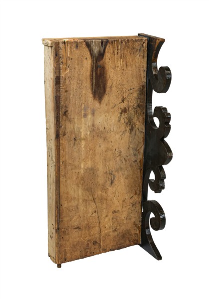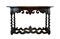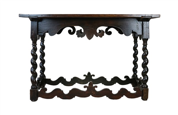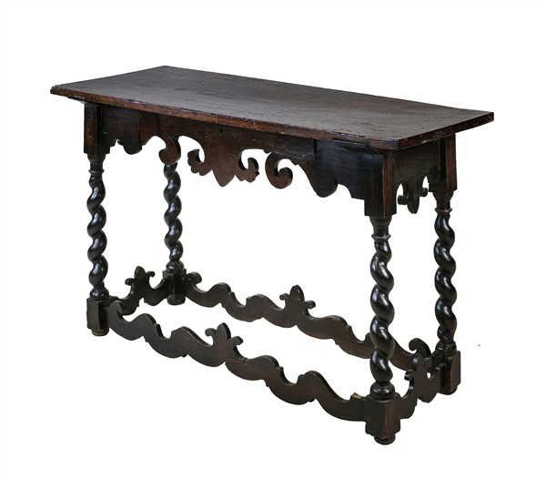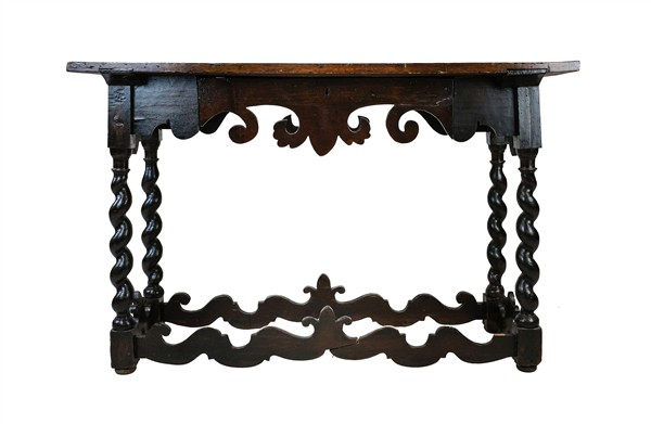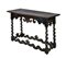 Tavolino da parete con cassetto nella fascia in legno a tinta scura, gambe a torchon riunite da traverse sagomate (cm 117x77x46) (difetti)