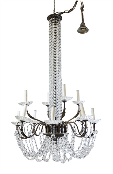 *Lampadario in metallo a dodici luci su doppio ordine, bracci sagomati con bobeche e pendenti in vetro sfaccettato (h cm 125, d cm 77) (difetti e mancanze)