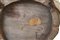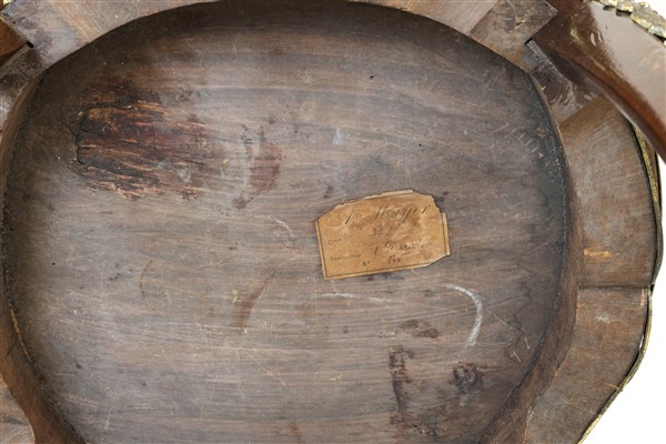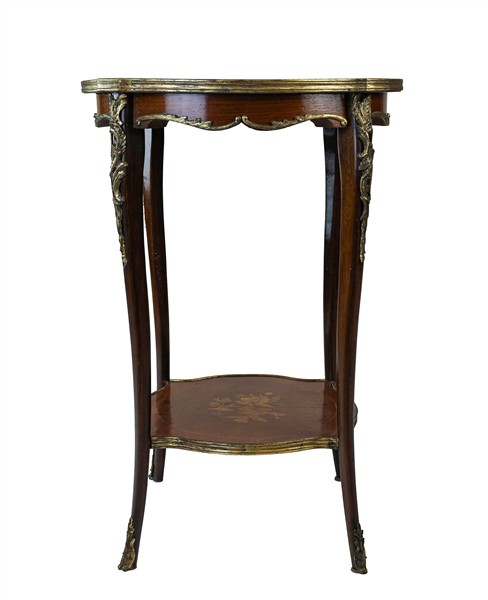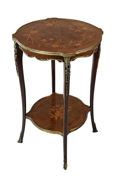 Gueridon di forma circolare a due ripiani, lastronato, filettato e intarsiato in legni di varie essenze con decoro floreale, profili e guarnizioni in metallo dorato. Inizio secolo XX. Reca etichetta cartacea sotto un ripiano (d cm 50, h cm 74) (difetti e mancanze)