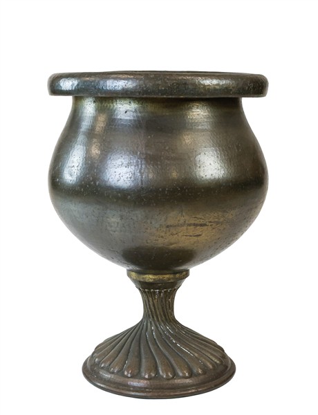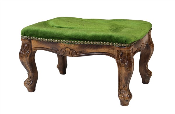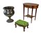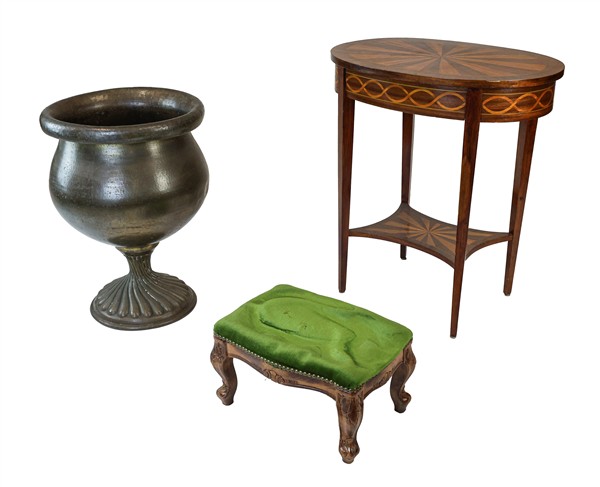 Lotto composto da un gueridon a due ripiani di forma ovale lastronato, filettato e intarsiato in legni vari, un poggiapiedi con tessuto verde borchiato ed un vaso portafiori in metallo con base baccellata (h max cm 72) (difetti)