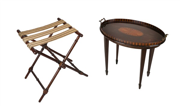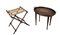 Lotto composto da un trespolo pieghevole in legno tornito ed un tavolino a vassoio intarsiato in legni vari, gambe a obelisco rovesciato. Inghilterra, inizio secolo XX (h max cm 53) (difetti)
