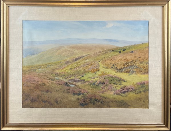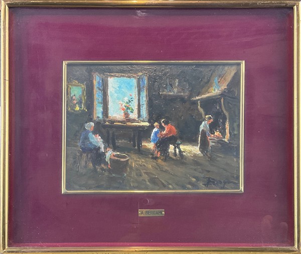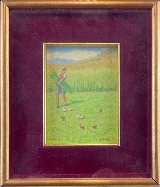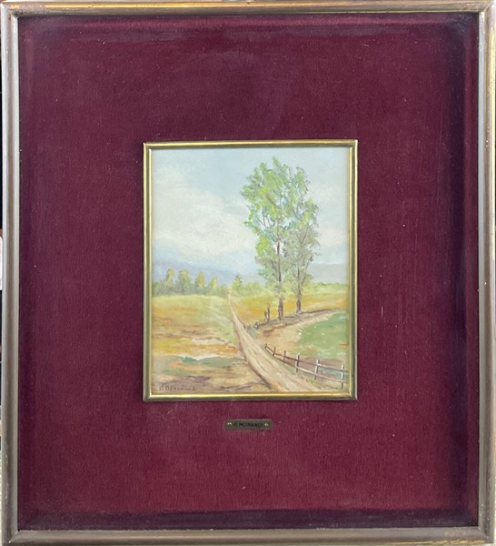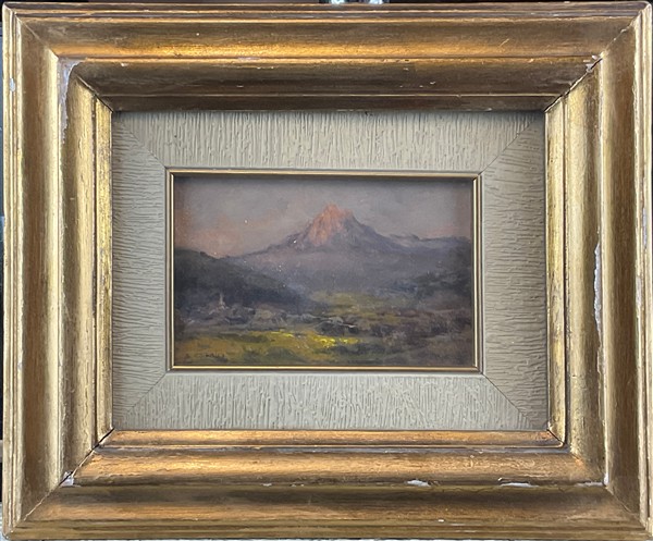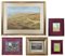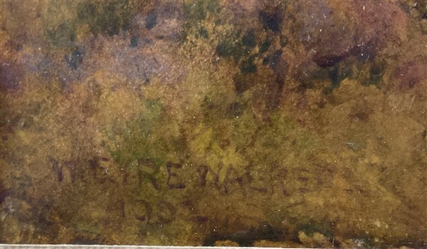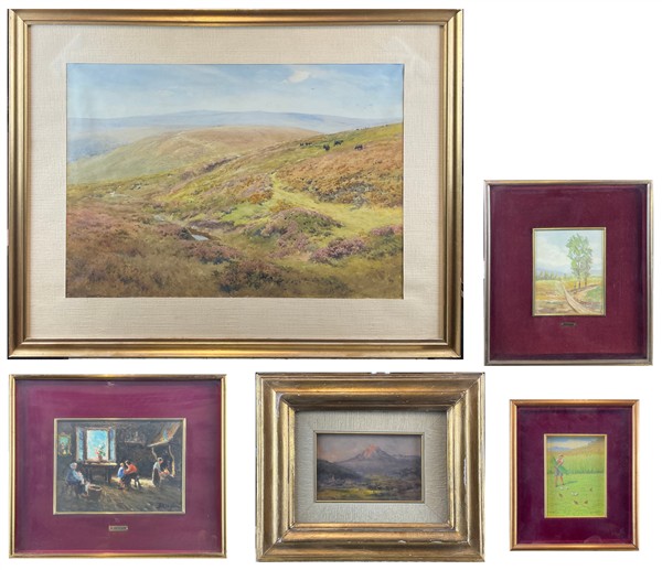 Lotto composto da un acquerello di William Eyre Walker (1847-1930) raffigurante un paesaggio canadese (cm 37x54,5) firmato e datato in basso a sinistra, unito a quattro dipinti ad olio di piccolo formato raffiguranti paesaggi e scena di genere. In cornici (lievi difetti)