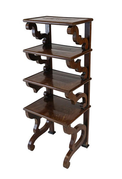 Etagère in mogano a quattro ripiani a scalare con sostegni a voluta. Secolo XIX