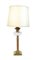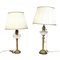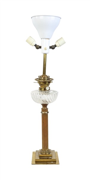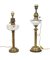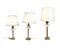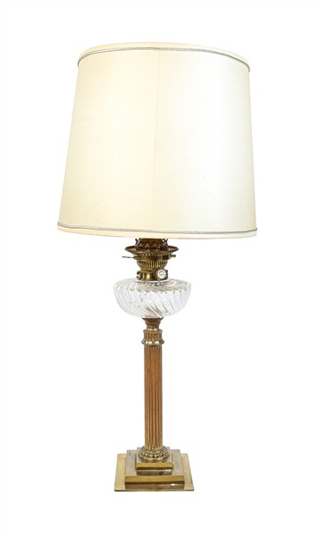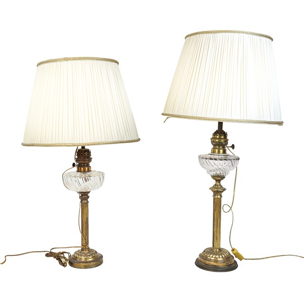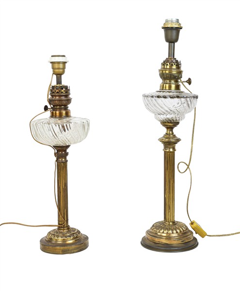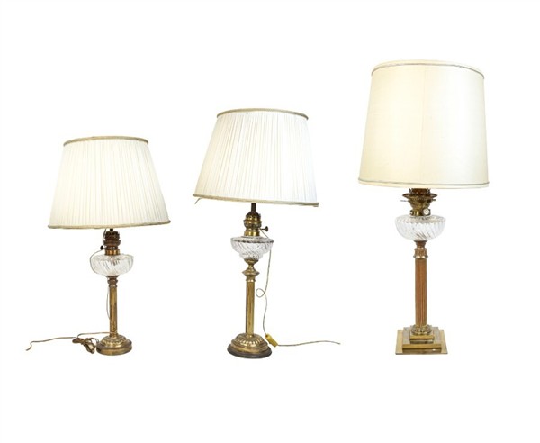 Tre lampade ad olio in metallo dorato con base baccellata e contenitore in vetro, elettrificate con paralumi in epoca successiva (h max cm 84) (difetti)