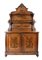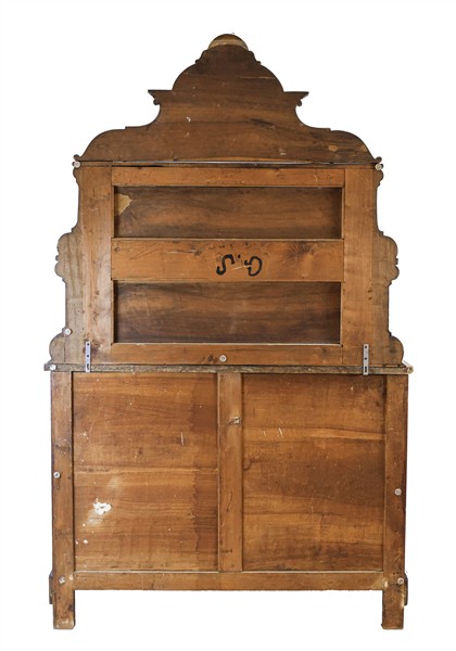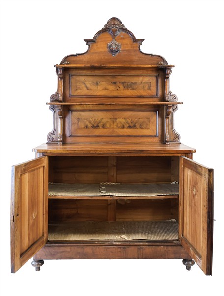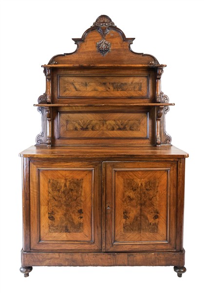 Credenza con piattaia in noce con specchiature in radica, parte inferiore a due ante pannellate e sopralzo con doppia mensola, cimasa sagomata ed intagliata. Secolo XIX (cm 123x205x52) (difetti)