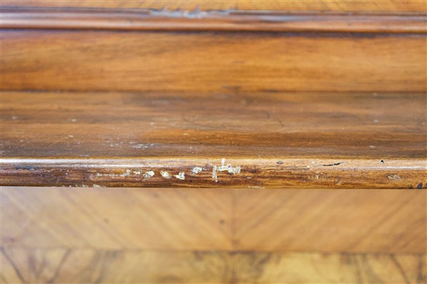 Credenza con piattaia in noce con specchiature in radica, parte inferiore a due