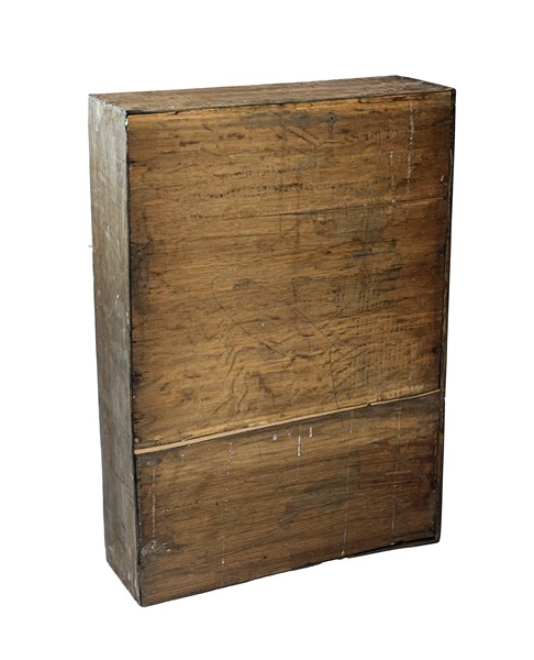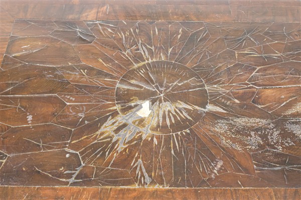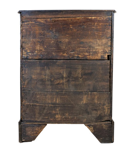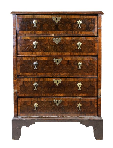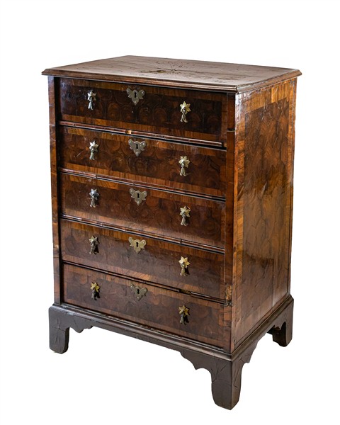Mobile cassettiera lastronato in legni vari, fronte a cinque cassetti e piedi a mensola. Inghilterra, secolo XIX (cm 67x94x47) (difetti e mancanze)