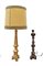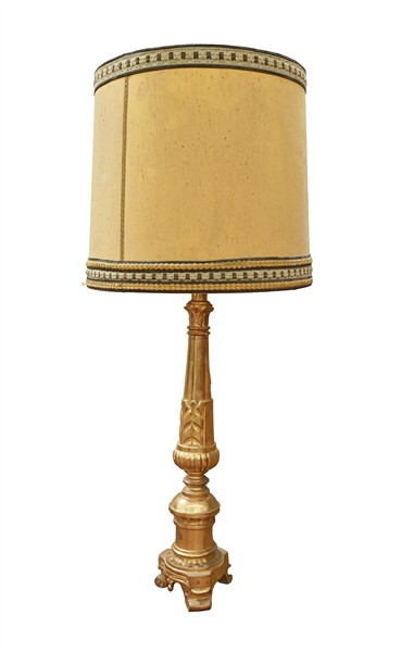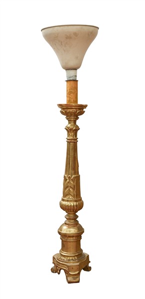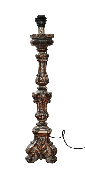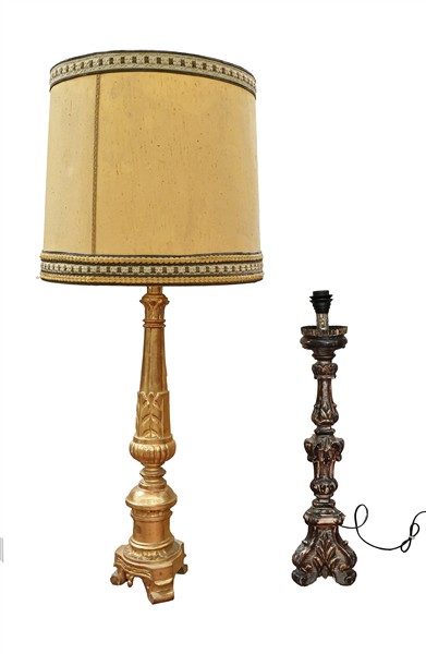 Lotto composto da due portaceri in legno intagliato di cui uno dorato. Secolo XIX (h max cm 75) adattati a luce elettrica in epoca successiva di cui uno con paralume (difetti e restauri)