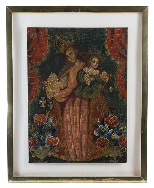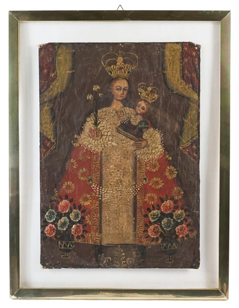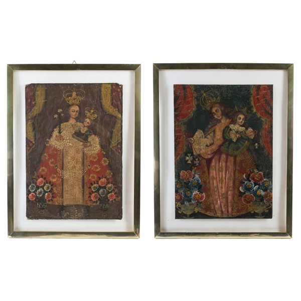 Scuola sudamericana. Due tecniche miste su tela raffiguranti la Vergine con Bam