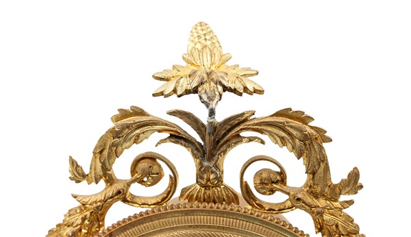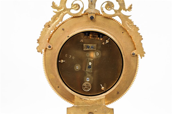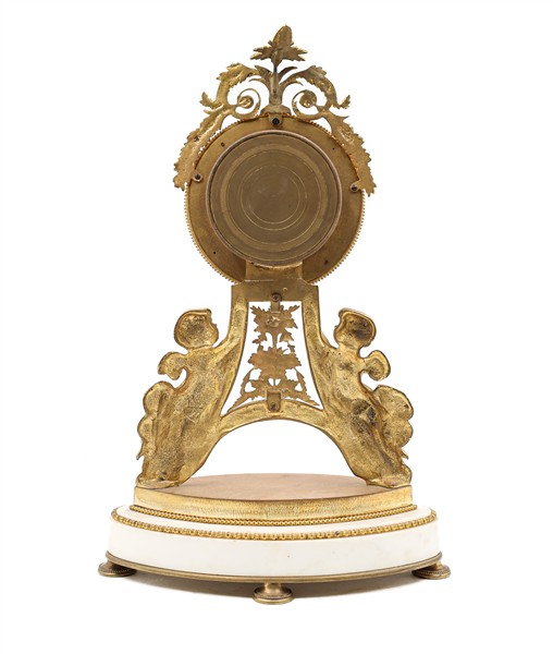Pendola in stile Direttorio in marmo e bronzo dorato decorata a festoni e putti. Quadrante a fascia in smalto bianco a numeri arabi e rosone centrale. Movimento a un treno con scappamento a bilanciere. Inizio secolo XX (h. cm 40) (difetti e gravi sostituzioni)