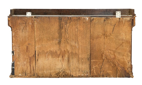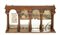 Pensile a struttura architettonica in legno intagliato con portico a cinque colonne scanalate e fondo con pannellature a specchio e dipinto (cm 106,5x57x19) (difetti, mancanze e restauri)