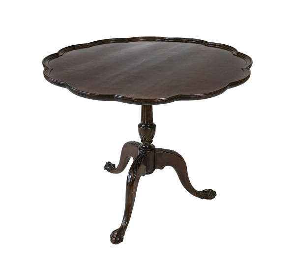 Tavolo in mogano con piano polilobato, sostegno scanalato su tripode con piedi ad artiglio su sfera. Inghilterra, secolo XIX (cm 80x67) (difetti)
