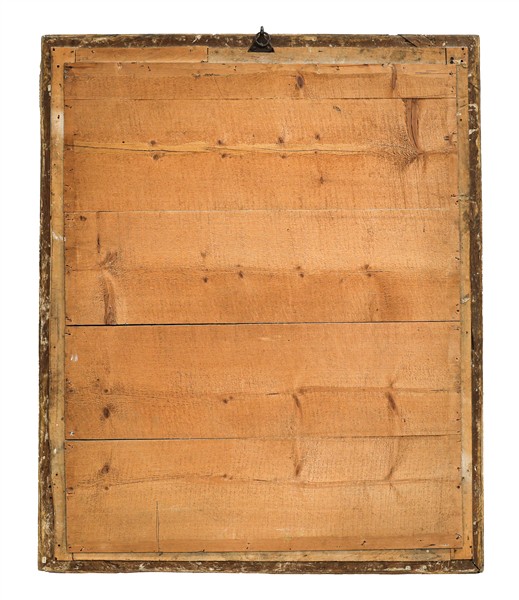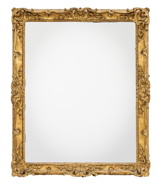 Specchiera di forma rettangolare con cornice in legno e stucco dorato con decoro a volute e fiori. Francia, secolo XIX (cm 108x88) (difetti)