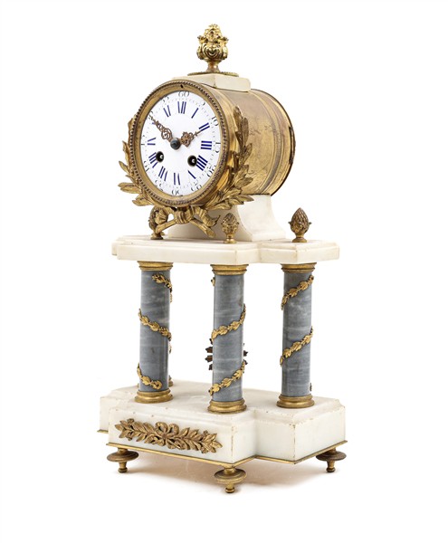 Pendola a portico in marmi vari e bronzo dorato. Quadrante in smalto bianco con numeri romani per le ore e arabi per i minuti. Movimento a due treni con suoneria delle ore e mezze su campanello. Francia, seconda metà del secolo XIX (h. cm 40) (difetti)