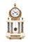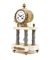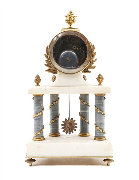 Pendola a portico in marmi vari e bronzo dorato. Quadrante in smalto bianco con