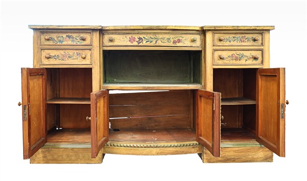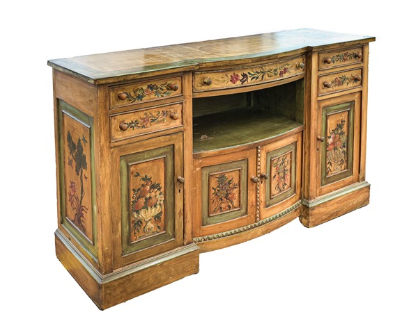 Credenza in legno laccato e dipinto a fiori con quattro ante, cinque cassetti e vano centrale. Inizio secolo XX (cm 181x102x55) (difetti, laccatura di epoca posteriore)