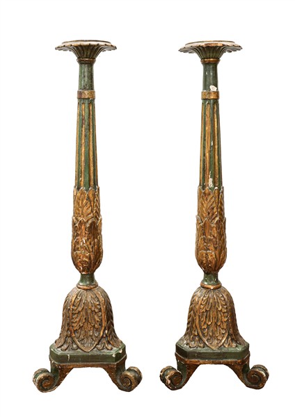 Coppia di portaceri in legno intagliato, laccato e dorato con fusto scanalato e decorato a foglie, base tripode. Secolo XIX (h cm 125) (difetti e restauri)