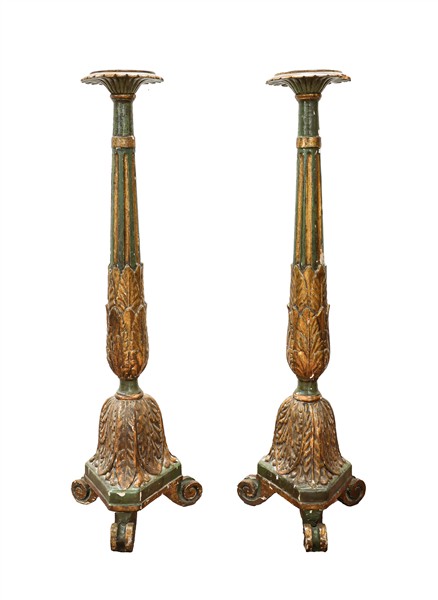 Coppia di portaceri in legno intagliato, laccato e dorato con fusto scanalato e