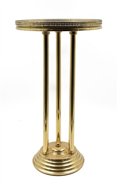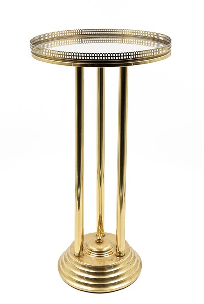 Tavolino circolare da appoggio in metallo dorato con tre sostegni su base circolare gradinata, piano in vetro, ringhiera traforata (h cm 54, d cm 31) (difetti)