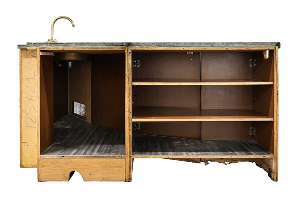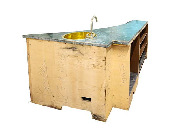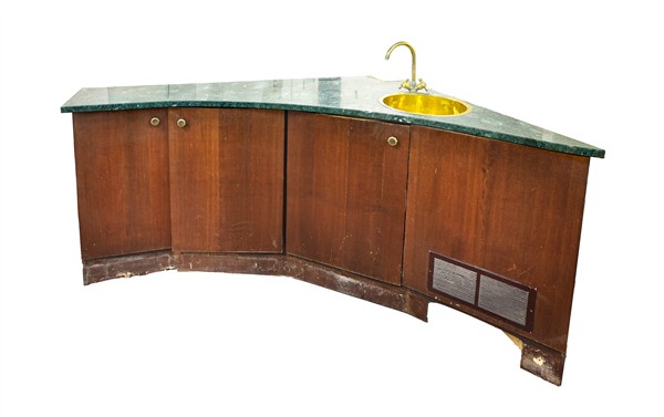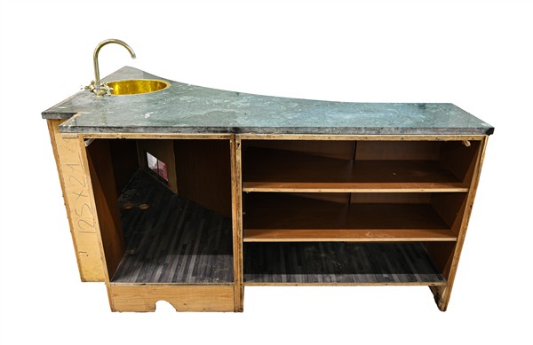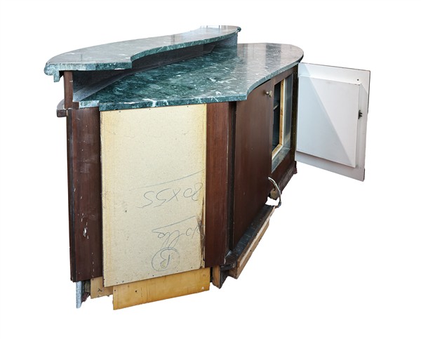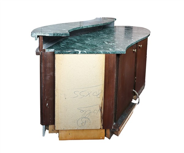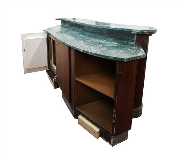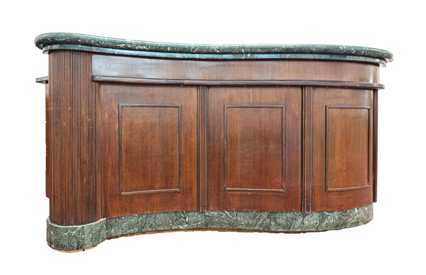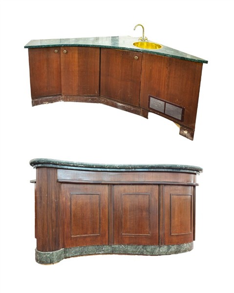 *Lotto composto da un bancone in legno di forma sagomata con profili cannettati e cartelle riquadrate, base e piano in marmo verde (cm 225x114x98), ed un mobile bar ad angolo con quattro sportelli e lavandino con rubinetteria, piano e profilo in marmo verde (cm 230x120x140) (difetti e piccole mancanze)