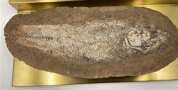 Lotto 1581 | Lotto composto da due fossili di pesce (l max cm 32) su base in metallo dorato